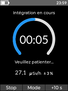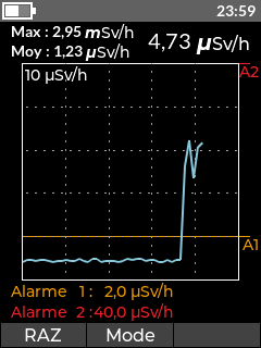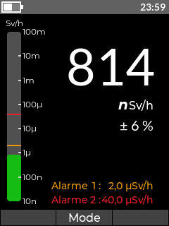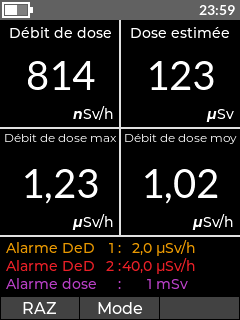 • Unité : nSv/h, µSv/h, mSv/h, µrem/h, mrem/h, rem/h